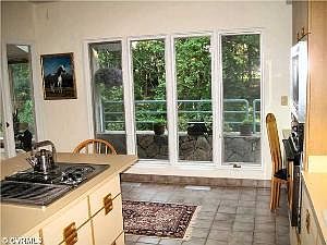 This smart sized home in Mooreland Farms offers first floor living with a master suite, formal rooms, kitchen, patio and garage. On the lower walk-out level are two bedrooms and options for more along with plenty of storage. This concrete home is built to weather any storm. The back side is almost all windows with views of the private back yard surrounded with hardwood trees. The vaulted ceilings and large wall spaces give this home scale for any gallery of art. Newer Roof (2010), Security System, irrigation, great location at the end of the street.