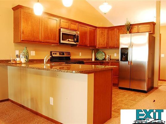 MODEL HOME. Welcome to Prairie Homes' luxuriously appointed 2 bedroom, 2 bath area townhome. This uniquely designed open floor plan features vaulted ceilings throughout the kitchen, dining and living room areas. Rich granite countertops, stainless steel appliances (including side-by-side refrigerator, range/oven, microwave and dishwasher) and birch cabinets with crown molding give the look and feel of a home twice the cost. Also included are full side-by-side washer and dryer and solid surface bathroom vanity countertops. Other features include brushed nickel door hardware, double garage with opener, full sod, sprinklers, low maintenance vinyl siding with stone belt line, nice deck, and so much more. Full basement is ready to finish. $75 per month association dues cover lawn care, snow removal and refuse service. Call today to view model of this home.