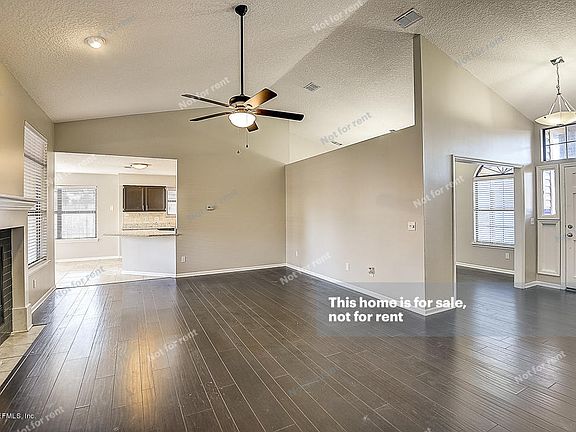 This Jacksonville one-story home offers a wood-burning fireplace, vaulted ceilings, stainless steel appliances, granite kitchen countertops, and a two-car garage.