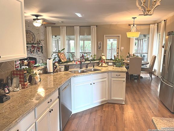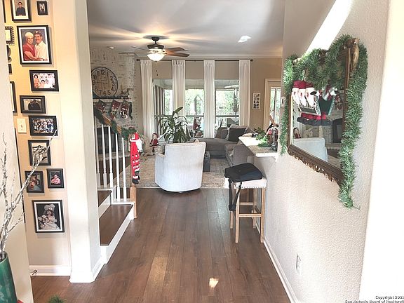 This beautiful home is located in the desirable Braun Oaks II community and sits on a semi cul-de-sac lot. First thing you will notice when you drive up to this home is the large beautiful mature oak tree. Once you walk into the home you will notice the tall ceiling in the entry and upgraded vinyl flooring throughout the downstairs including the master bedroom. There's a separate dining room that leads into the kitchen that has upgraded granite counter tops with tile backsplash and stainless steel appliances. The kitchen overlooks the living area that features a beautiful painted brick wall with a gas fireplace. Master bedroom is located downstairs that has nice size bathroom with huge walk in closet. Upstairs you will find a large game room or second living area and 3 nice size bedrooms. Best part of this home is the 19 x 11 screened in porch with 4 skylights that your buyers can easily relax and drink their coffee in the morning. The beautiful private backyard also has two sitting areas, one a large wooden deck and other stained deck with pergola. Another great feature of the back yard is a large wood shed with electricity! The 5 mature oak trees throughout the backyard are also a nice backyard appeal! This home is definitely one you need to show your buyers!