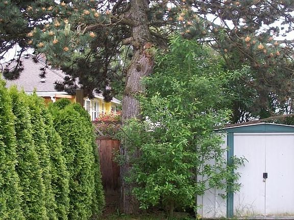 2 bedroom, 1 bathroom, kitchen and bathroom remodeled w/ tile in 2005, hardwood floors, vinyl window upgrade in 2006, private backyard with large raised bed garden, garage plus two storage sheds, gas furnace, dishwasher, includes stove and refrigerator.