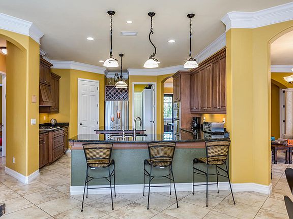 This beautiful home front and back water view located in the gated community of Tropical Cove features 4BR, 3 bath heated pool, and Spa, outdoor kitchen and a 3 car garage with an EV-charger for electric vehicles. As you walk in you will notice the beautiful rotunda and lots of details such as crown molding and baseboard throughout the house, plantation shutters, and unique lighting fixtures. Dining room, den/office, living area, breakfast nook, and TV room just to name a few rooms of this high-end home. The stunning and spacious granite countertop kitchen features a huge island, all stainless steel appliances, propane gas stove with powerful exhaustion hood and a walk-in pantry, making it perfect for entertaining. two sets of French doors lead to this paradise pool area with a great sitting space and an outdoor kitchen with a built-in propane gas grill and spa. Plenty of room to relax in the all screened deck overlooking the water. Next to the kitchen is a wet bar also with granite countertops. one of the guest bathrooms serves the pool area and has a shower set up to become a steam sauna. The great master bedroom has a tray ceiling, decorative columns.
