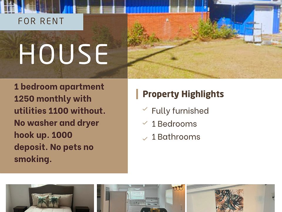 1 bed 1 bath upstairs apartment. fully furnished no washer and dryer hook up. newly renovated No pets no smoking Short term rentals are 1600 a month..rent without utilities is 1100 with a year lease agreement and 1250 with utilities