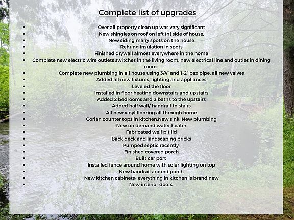 This spacious home was just recently redone top to bottom. Starting with a new on demand boiler with in floor radiating heat, plumbing (PEX pipes), fixtures and flooring throughout the home. Three bedrooms, 2 baths upstairs including a primary with new attached full bathroom. Two small bedrooms on the main floor along with a large guest bathroom and laundry room. In the kitchen you will find new cupboards and appliances, Corian counter tops and a large butcher block island. Enjoy the green views from the large back deck. 2 sheds on property for storage, covered porch and new car port are ideal for all seasons. Down the road you will find your shared access to the Little Manistee River, catch salmon or trout or just relax. 1/4 mile up the road is popular Harper Lake access and boat launch.