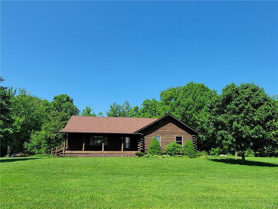Authentic Log Cabin nestled on 17.95 acres meticulously cared for by original owners. 3 bedrooms on 1st floor including a spacious owners suite with full bath. 2 additional 1st floor bedrooms plus a 2nd floor bonus room that could easily be a 4th bedroom. Modern kitchen, spacious great room, hardwood floors, 1st floor laundry, full dry basement, covered front porch, deck, 2 car detached garage with screened in area and a beautiful scenic pond. Convenient location just minutes to the NYS Thruway. Public water is available for hookup. 2021-07-02