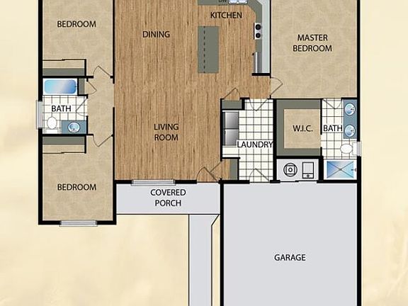 Beautiful wood-look flooring and high ceilings enhance the sense of space and there are slider doors that invite you to step out to the covered rear patio. A laundry room and a large 2 car garage complete this must-see residence.