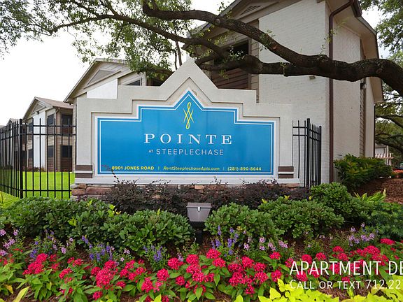 REF: # H2729. Refer this number when you reaching us about this AD. Description: Pointe at Steeplechase is a newly remodeled apartment community that has everything you are looking for in an apartment home. Located conveniently near major freeways allowing for an easy commute, Pointe at Steeplechase is a gated community that gives you peace of mind and private luxury. You'll enjoy our professional landscaping and exceptional amenities, including two refreshing pools, a fitness facility, and community grilling areas. Each apartment comes with spacious walk-in closets, patio or balconies with storage areas, and washer/dryer connections. We are also proud to offer second chance leasing, and we're happy to work with rental histories that include broken leases (under certain conditions). Please contact us for more information! Voted By Houston Apartment Association Property of the Year! Cats Allowed: monthly pet rent: $15, one time fee: $300 Dogs Allowed: monthly pet rent: $15, one time fee: $300 Lease Options: 6 - 12 month leases: Other Fees: application fee: $55 Property Information: built in 1979: , 168 units/2 stories: Apartment Features: High Speed Internet Access, Washer/Dryer - In Unit, Washer/Dryer Hookup, Air Conditioning, Heating, Ceiling Fans, Cable Ready, Storage Units, Tub/Shower, Fireplace, Dishwasher, Disposal, Granite Countertops, Pantry, Kitchen, Oven, Range, Refrigerator, Hardwood Floors, Carpet, Tile Floors, Vinyl Flooring, Dining Room, Walk-In Closets, Linen Closet, Window Coverings, Patio Community Amenities: Laundry Facilities, Maintenance on site, Business Center, Clubhouse, Storage Space, Corporate Suites, Fitness Center, Pool, Gated Unique Features: Access to Public Transportation, All Electric Kitchen, Assigned Parking - Additional Charge, Beautiful Landscaping, Breakfast Bar, Brush Nickel Light Fixtures, Carpeted Floors, Copy & Fax Services, Granite counter tops, Hardwood Floors, High Speed Internet Access, Kids club, Mini Blinds, Pantry, Part Time Courtesy Patrol, Public Parks Nearby, Solar Screens *, Spacious Walk In Closet, Spectacular Views Available, Vertical Blinds, Wood Burning Fireplace