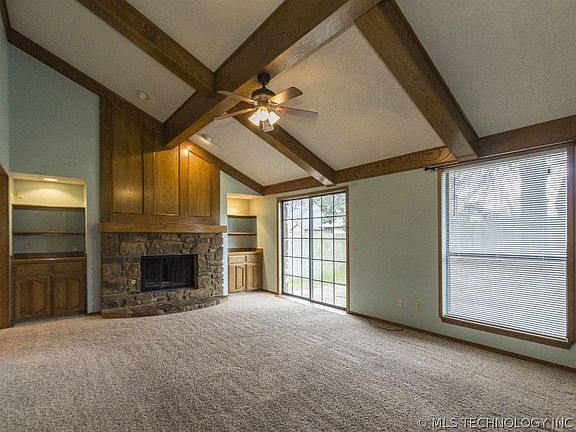 Lovely living room with natural light, a stunning vaulted ceiling, and built-in bookcases on both sides of the fireplace. 3 bedroom, 2 bath home with a separate utility room. Dining area conveniently located in between the kitchen & living room.