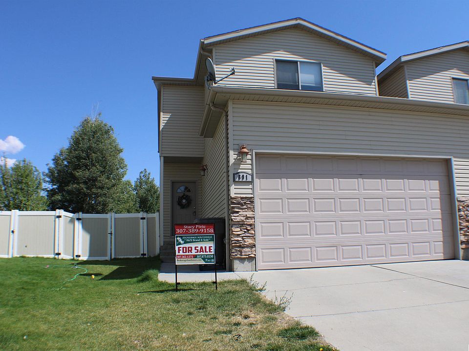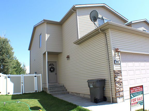 This move-in-ready twin home is well maintained! Enter this two-story residence featuring three bedrooms and two and a half baths, with an open floor plan that includes a large kitchen with knotty pine cabinetry, a beverage bar with additional counter space, a pantry, and stainless steel appliances. The living room features a built-in entertainment center and opens up to a spacious deck and yard. For added convenience, there is a half bath on the main level. The upper level boasts three bedrooms, including a generous main suite with two closets and a private bathroom, along with a main bathroom and a laundry room. The home is situated on a large lot with a vinyl fence and a storage shed. A new hot water heater was recently installed! This well-built home is constructed by Haden Construction and is conveniently located near shopping and schools. Contact Stacy Pivic at 307-389-9158 to see this home or for more information!