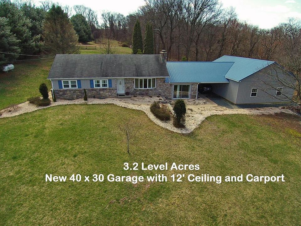 *** Seller will review all offers Monday evening 5/18/20. Ask your Realtor to email the listing agent for a link to the virtual tour, or contact listing agent if not represented by an agent ***. Showcased far off the street on 3.2 level acres, this rare find offers privacy and is ideal for gardens, automotive hobbyists, and one horse (buyer due diligence required regarding horses, buyer must contact township to discuss required hearings for horses). This gorgeous 3-bedroom home is currently configured as a 2 bedroom to create a massive owner's bedroom - easily converted back to 3BR if desired. This property has something for everyone. NEW 40 x 30 Garage with 12-foot ceiling height - nicely integrated with the home via NEW carport and scissor trusses which create clearance for automotive lifts, while maintaining a roofline that fits nicely in a residential setting. The radiant garage floor heating system is installed with areas engineered for mounting a two-post lift without affecting the heating lines, and intended for use with a future propane water heater or propane boiler if desired. The rear-facing 10' x10' garage doors allow you to tinker without onlookers and open to oversized level parking behind the garage, offering plenty of room for horse trailers, car trailers, and whatever projects you may want to dig into that you wouldn't necessarily want sitting in front of your house. The parking area includes a NEW oversized carport offering a covered ground-level entrance - handy for bringing in the groceries and accessing the shop in inclement weather. Beautiful stone walls and steps offer definition between the parking and back-yard paradise. You'll love this home's Open floorplan!!! NEW gourmet kitchen lavished with NEW cabinets including 42" upper cabinets, complimented with volumes of NEW quartz countertops with NEW under-mount sink and NEW fixtures, NEW wide plank-style flooring provides stunning contrast, while NEW stainless steel appliances including a NEW stainless steel range hood complete this custom kitchen (Refrigerator is negotiable). The removal of a non-loadbearing wall yielded a massive country kitchen with room for a huge island if desired, and offers openness through the living room with wood-burning fireplace equipped with LP gas logs, the fireplace is real stone. Glass sliders lead to a porch offering shade, plus a large wrap-around patio for the entertainer and sun-lover, within an alcove of craftsmen stone walls. The large sunken family room is bright and cheery with glass slider, the adjoining recently remodeled full bathroom is quickly accessible from the carport - handy if tinkering in the garage or gardening. You'll love the main level laundry located in the newly updated full hall bath with a NEW shower and NEW flooring - single floor living at its finest. Partially finished basement with wood burning fireplace adds even more living space and Bilco door egress. The home previously belonged to the neighboring greenhouse farm, and the backyard was leveled to accommodate a huge greenhouse and sizable outdoor gardens - ideal for a riding-ring, an old foundation exists which would be a perfect start for a barn or horse run-in shed if desired. The laundry was originally located in the basement and can be changed back if desired. NEW LP gas water heater. The home has been updated from electric baseboard heat to LP gas heat & Central Air, a couple of the original baseboard heaters are still installed but are not needed. This home qualifies for Zero Down USDA Financing. No HOA fees or rules!