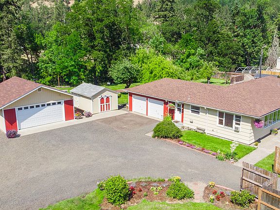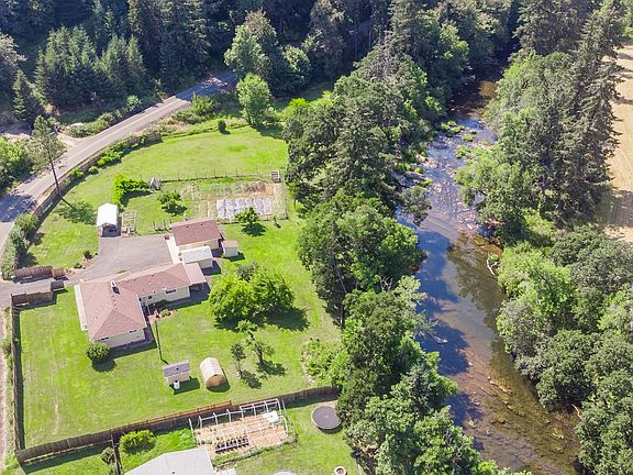 Seller Credit for Buyers Closing Costs. Welcome to this exquisite, private waterfront farm, nestled on Elk Creek, a true outdoor paradise! This 2.2-acre property features rich, organic soils enhanced by Steve Solomon, founder of Territorial Seed Co. A nearly 700-foot creek frontage with deeded water rights. The irrigation pump ensures abundant water for the entire farm.The lovingly restored mid-century home offers stunning hardwood floors, a cozy fireplace, built-in shelving, and ample natural light throughout. The attached garage includes a vintage workbench, while the oversized second garage and multiple sheds provide extensive storage and full electrical hookups.The property boasts 22 fruit-bearing trees, including apples, pears, cherries, plums, as well as five types of grapes vines. The 8,600-square-foot garden, enriched with organic amendments, features four redwood raised beds, a triple compost area, two predator-secure chicken coops, and a large outdoor stainless-steel sink with water. Towering oak trees provide mulch and shade, supporting a biodiverse ecosystem that attracts wildlife such as deer, foxes, beavers, river otters, and various bird species. Two thriving beehives are included, with bee suits and equipment stored in a back shed. The creek frontage is a private beach most of the year, with bedrock extending to the center of Elk Creek, offers amazing wildlife viewing, fishing, kayaking, and swimming. Enjoy the serene beauty and natural song of the water. Modern updates to the home include a newer roof, windows, doors, plumbing, electrical work, and refinished wood floors. The well house features UV light, sand filter, and reverse osmosis for pure drinking water. Fiber optic internet ensures you stay connected while enjoying the tranquility of country living. Centrally located with easy access to Eugene, Roseburg, and the Oregon Coast, this serene and sustainable property offers a rare opportunity for harmonious living.