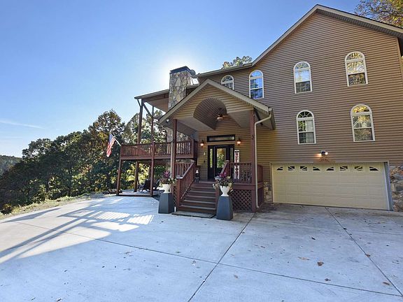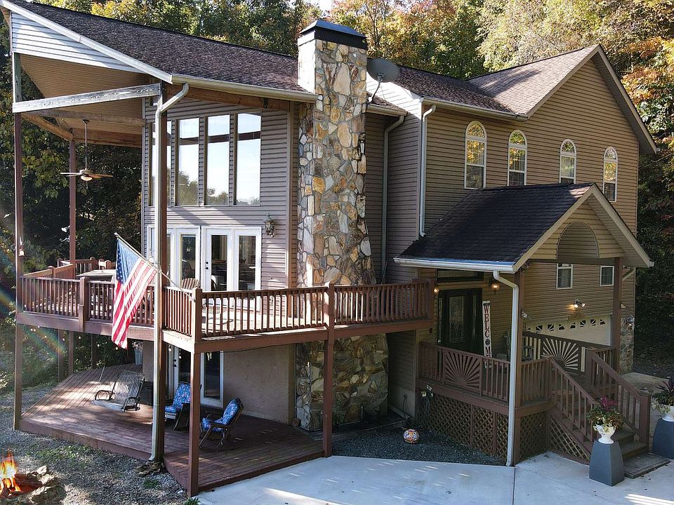 SIGNIFICANT PRICE IMPROVEMENT--River views & mountain views, in addition to 50' of river front. No need to settle for just one of these mountain living pleasures when you can have all three. 2.32 acres provides privacy, usable outdoor space as well as plenty of guest parking. Desirable prowl front of this spacious home fills every level w/ natural light. The main level living room is adorned w/ one of two stack rock gas fireplaces & French doors. You won't miss anything while working from the kitchen thanks to the open concept. Bonus of double ovens for baker's delight. Convenience of laundry on main, off the kitchen. Sizable master, jetted tub, grand walk-in closet. Enjoy a sitting area/office in the loft & hideaway or entertain downstairs in the family & game room w/ walkout access. Plenty of room/storage throughout including oversized attached garage. So much space for your family & friends to gather.