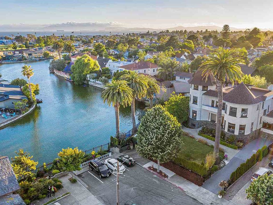 This stately Alameda historic mansion balances elaborate entertaining with the warmth of home. Greeted by an expansive, wood adorned foyer and gallery, the main floor includes a spacious living room, formal dining room, den, office, bath, and modern kitchen with eat-in space. and separate laundry area. The stunning stained glass windows invite you up the staircase to the living area. The master bedroom, with adjoining dressing room and master bath, boasts views of the formal yard, lagoon setting and bay. In addition to the remaining four bedrooms, three and a half baths, second laundry, and a 2nd sizeable office with lagoon views, private bath, and stairs leading to a loft area high in the upper turret. The lower level, an additional 2,600+ sq ft, opens to a sweeping ballroom area and bar and includes a bed, bath and kitchen area. Outdoors, you'll find an entertaining area in the back, greenhouse, and large deck accessible to the lagoon.