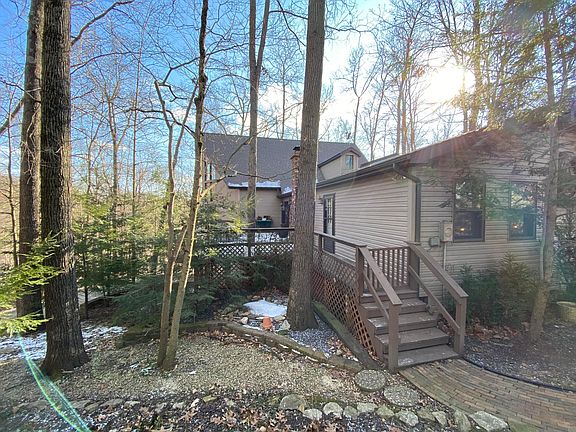 Quiet court setting above main lake & docks, royally rustic room to roam & relax outside & in. Located in Hide-A-Way Hills,so naturally near the famous Hocking Hills, & adjacent to 50+ acres of community common woods & space. Go take a hike,enjoy morning coffee on wraparound decking & treetop screened porch, visit North Park area to launch watercraft. Neatly blended classic original cabin & newer prow-style contemporary home, w/5 fireplaces, 2 kitchens & much more. 5-6 BR,4 BA,great gathering & recreation spaces,2-vehicle garage + plenty of level parking & varied storage. Soaring,stunning family rm,formal dining+eat-in spaces,custom upscale wallpaper,classic premium fixtures,wood floors,ceramic&slate tile,upgrade carpeting,fans. Grand foyer, premium wood trim & windows,loft owners retreat.