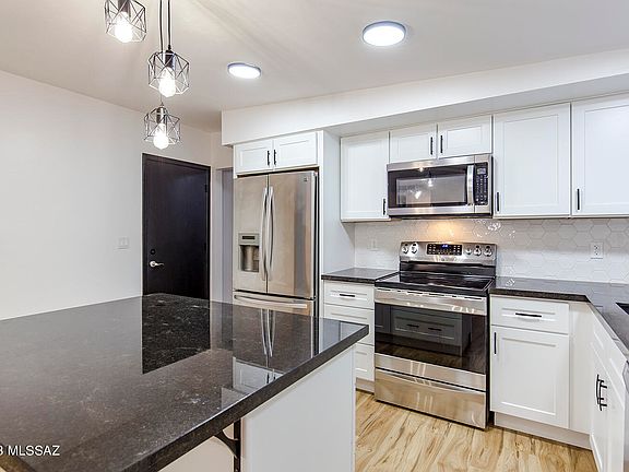 Owner/Agent - Beautifully redesigned 3 Bedroom home with bright & spacious living areas. Open concept eat-in kitchen featuring black granite countertops, stainless Kenmore appliances and backsplash tile to the ceiling. Master Suite with walk-in closet with custom built-ins & an ensuite with a double vanity, rain head shower, frameless glass doors & custom tile work. Storage! Large Laundry Room, spacious closets in all bedrooms, two hall closets and a storage room in the backyard. Front & back yard are beautifully landscaped with a mix of desert landscaping, mature trees including pistachio, palm & citrus and flower beds.Walking distance to Henry Elementary & Saguaro High School as well as the Eastern Hills Aquatic Center. Heating/Cooling System in 8/2020 - Roof Coated in 2023.