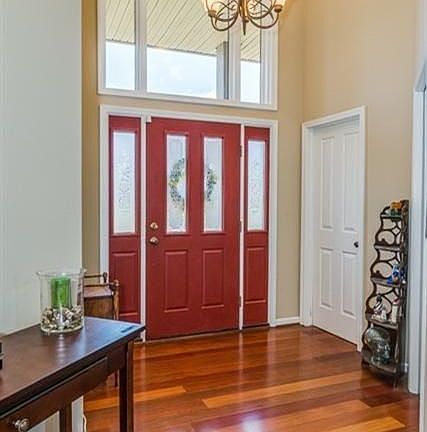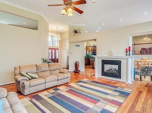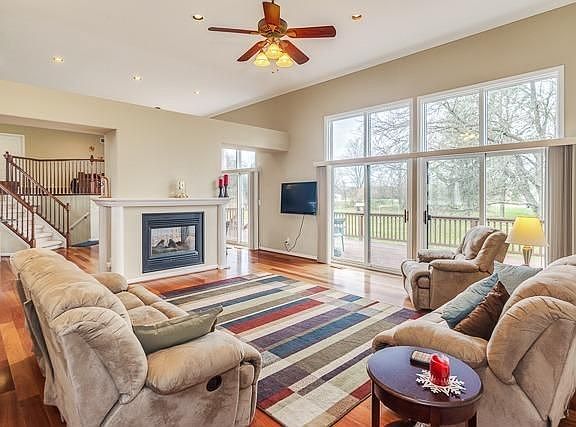 Custom built home on 2.28 acres on a private paved drive. The 12' ceilings on the entry level creates added volume and beautiful views overlooking a large deck. A two way fireplace gives a warm feel to the Brazilian cherry floors throughout the great room and dining area. The kitchen features cherry cabinets, granite counter tops, and stainless appliances. The entry level also features a study and a master suite. Up a short flight of stairs, a family gathering space overlooks the kitchen and dining area. Two large bedrooms share a jack and jill bath. The lower level walk out features a laundry, full bath, bedroom, exercise room, and media room. The site also includes an attached 4 car garage, and a newer pole barn.