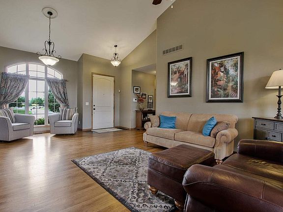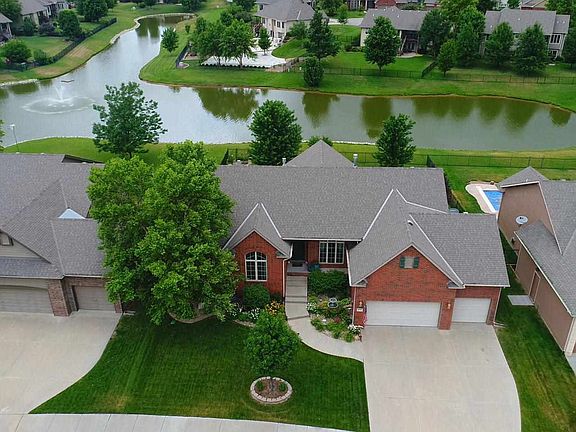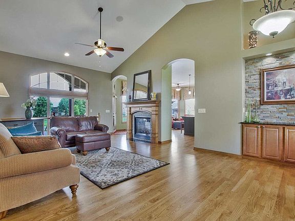 Waterfront property in desirable Fox Ridge subdivision. Quality custom built home by Masterpiece Home. Magnificent entrance with 9 foot front door. Appealing floor plan with arched bullnozed doorways, vaulted ceilings, and a large formal dining room. Kitchen features granite countertops, large island, large walk in pantry, gas stove, upgraded stainless-steel appliances. There is a separate main floor laundry with built in coat rack and bench. Two-way fireplace from living room to kitchen and a hearth room with large windows for viewing the lake. The master suite offers access to the deck, his and her vanities with granite, a separate tub and shower. The walkout basement offers a gas fireplace with blower, wet bar, custom built entertainment center with surround sound throughout. Exterior features includes a covered maintenance free Tek-Dec, wrought iron fence, sprinkler system, irrigation well, flagstone patio, and the addition of the Lake Rock. Many upgrades throughout include water softener, battery backup, all granite tops, adding backsplash above showers, beautiful landscaping.