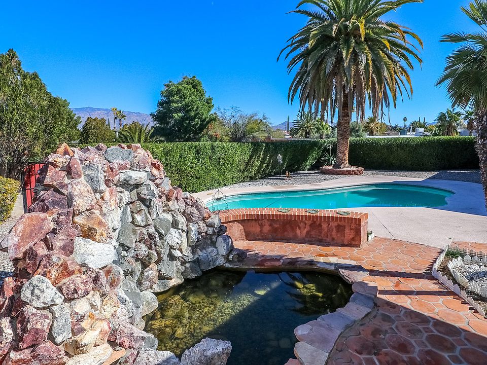 Beautiful one story slump block 3bed/2bath home with GORGEOUS BACKYARD & GORGEOUS VIEWS!!! This home offers tons of character with two fireplaces, amazing views from the kitchen, adorable bonus room (previously used as a sewing room), storage/workshop, built in BBQ, pool, water fall feature w/pond, BEAUTIFUL PALM TREES AND LANDSCAPE! All new electrical work for pool pump including new sub panel and new wiring from shed to pool equipment. This home is located in a great neighborhood and only 3 minutes away from Sahuaro High School. Vehicle in garage (only 26K miles) can also be purchased using a separate Bill of Sale.