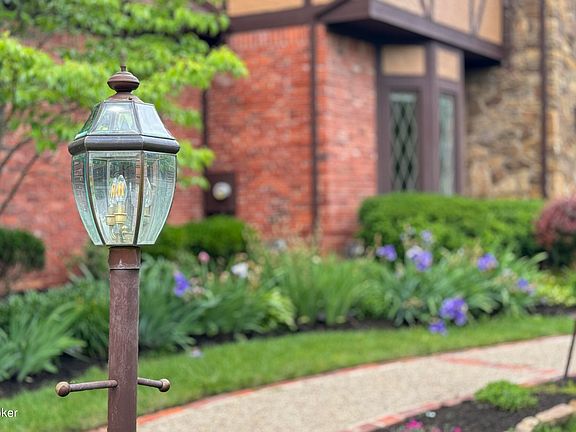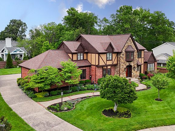 Welcome to this timeless Tudor-style estate nestled within the highly sought-after Oxmoor Woods community, boasting lush landscaping and a three-car garage. The grand two-story entry welcomes you with the warmth of classic parquet wood floors and abundant natural light . Flanking the foyer, the formal dining room and living room offer timeless elegance, adorned with hardwood floors and intricate trimwork on both walls and ceilings. The living room flows seamlessly into the spacious family room, featuring a coffered ceiling, a built-in wet bar, a wood-burning fireplace, and access to the enclosed patio. Entertain with ease in the spacious eat-in kitchen, equipped with ample cabinetry, granite countertops, stainless steel appliances, a center island, and a sunny vaulted dining area. Retreat to the luxurious primary suite with its vaulted ceilings, spa-like en suite with dual granite-topped vanities, marble tile flooring, walk-in shower, and water closet for added privacy complemented by thoughtfully designed dual walk-in closets with built-in safe and closet system for optimal organization. A half bath and laundry with rear stairwell access to the upper level complete the first floor. Filled with an abundance of natural light through a most charming window seat with a built-in bookcase, the upper-level landing leads to four spacious bedrooms, each adorned with custom plantation shutters, and two full baths. The lower level offers a haven for relaxation or entertainment, featuring a large family room with a second fireplace, a full bar area/second kitchen, three bonus rooms, a fourth full bath, and ample storage space. Enjoy the outdoors rain-or-shine from the enclosed patio with brick-paver floor, vaulted ceiling with skylights and hot tub or unwind on the spacious deck with pergola, overlooking the partially fenced backyard. Seller to offer an America's Preferred one year home warranty. Conveniently located in the East End, this home provides easy access to retail and dining options along the Shelbyville Rd and Hurstbourne Ln corridors.