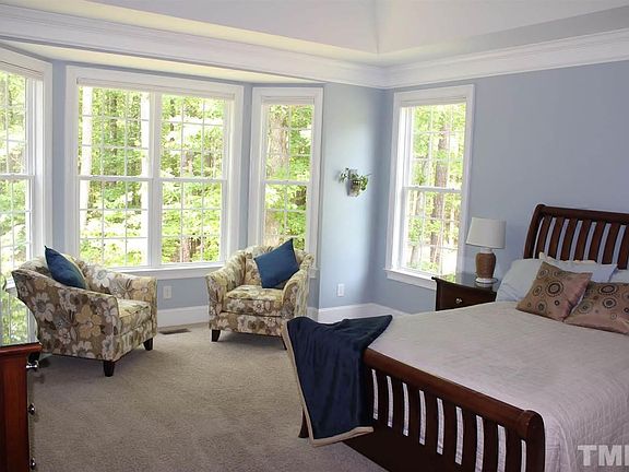 Remarkable home w/Exceptional features. 1st flr Master.Hardwood Floors.Soaring 2-story stone FP in family room.Bright sunroom off kitchen w/ Granite, SS appliances, tile backsplash, large pantry. Dining room w/ custom built in china cabinet. Master w/ deep trey ceiling, dual bath vanities, largeWI closet.2nd floor guest w/full bath. Walk-in attic. Deck & large stone patio. Close to I-540,US-70, Umstead.