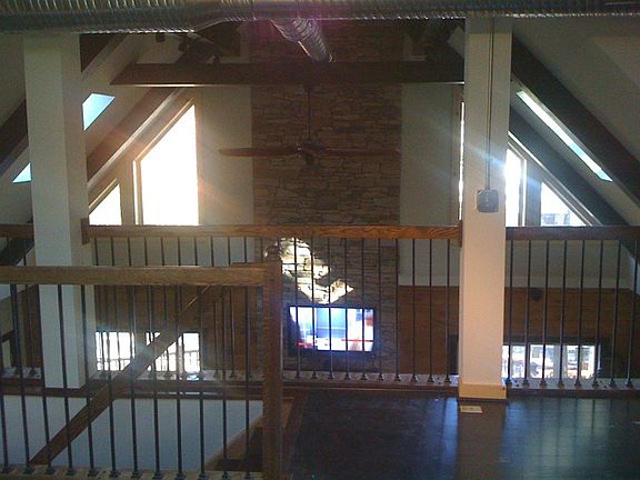 A-Frame, faux-log sided, with faux stone modular. 2 car garage under home. 3 full baths, master has soaking tub and large frameless glass shower, basement has frameless glass shower. Guest bathroom has custom faux stone accent wall behind sink. Partially Finished basement (Laundry room is not). Custom hardwood floors throughout. Basement has vinyl laminate and high end carpet. Kitchen has heated quarry stone floor, granite counter tops, island bar, faux brick backsplash. (1/4 faceplate real brick). All stainless appliances. Large pantry. Exposed ductwork and ceiling fans with cross beams in main room. Wood burning fireplace. Most ceilings in rooms have tongue and groove pine planks. Loft has faux-brick accent wall with pine accent walls. Skylights in loft and master bath. Large composite deck. Outdoor living space has a grotto-like swim pond with waterfall that is salt water chlorinated. Beautiful landscaping with car port transformed into a patio sitting area with ceiling fan and outdoor fridge.