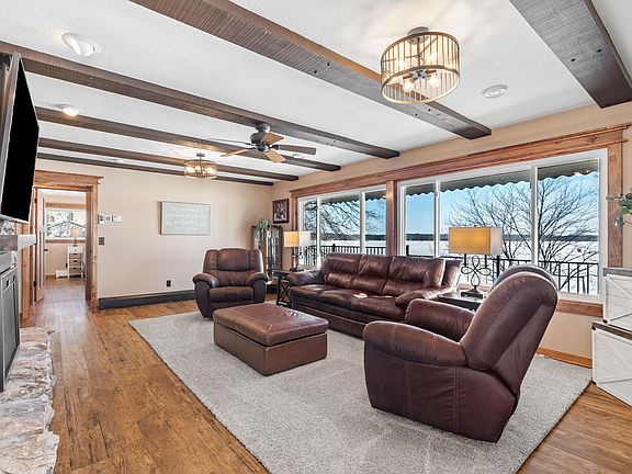 Cedar Lake Waterfront Retreat! This stunning 4-bedroom, 3-bathroom home is situated on a spacious 0.48-acre lot with 100 feet of sandy lake frontage and breathtaking panoramic views. Enjoy ultimate privacy with woods behind the property, creating a serene and peaceful setting. This beautifully updated home features brand-new windows, HVAC, insulation, and a completely updated interior throughout. Vaulted ceilings, two fireplaces, a coffee bar, and fully renovated bathrooms add to the charm and comfort. The lower level boasts two bedrooms, a brick-surround fireplace, a wet bar, a 4-season porch, and a covered patio. Step outside to a maintenance-free deck, a lakeside bunkhouse, a firepit patio, a storage shed, fresh landscaping, and a sprinkler system for a lush yard. With a dock included and lower-level storage for all your lake toys, this property is the perfect blend of luxury and lakefront living. Just minutes from the public boat launch and beach—don’t miss this incredible opportunity!