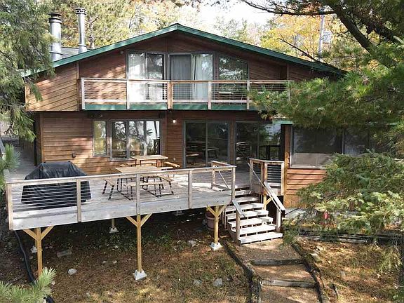 This could very well be one of the coolest most unique properties on this magnificent lake. And take an imaginary cruise on the 1923, 34ft. Bridger Deck Cruiser built right into this home... We have 6 Bedrooms, 6.5 baths open floor, amazing kitchen, fireplaces in some of the bedrooms, guest cottage, wonderful relaxing decks, and huge pole building, This works perfect for a VRBO of as your personal residence with room for all. Nice rocky shoreline with excellent depth off the dock.. the south facing view to Head-0-Lakes Bay is awesome... If your looking for a business opportunity or a lake-home... this ones worth a peek (6th Bedroom 18x24) - All measurements to be confirmed by Buyer or Agent, currently a VRBO, showing to be scheduled around vacancies...
