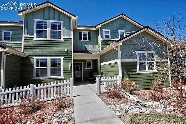 Great move in ready townhouse located in the master planned community of Wolf Ranch, near the Powers corridor! This 2 bedroom townhome features an open concept main floor, with laminate hardwood style floors. The kitchen comes with all appliances including the fridge (which are hard to come by right now), a breakfast bar style island, and a pantry. Spacious under stairway storage and a 1/bath. The upper level offers a spacious primary bedroom featuring an attached bath with dual sinks and shower. The large secondary bedroom has views of pike peak and is close to the full Bath. The loft would make a great office, or family room area and has lots of natural light! There is also a convenient upper level laundry with cabinets and washer and dryer included. This home has central air conditioning too!!! It is minutes away from neighborhood schools, parks and shopping. You don't want to miss this!! It won't last long!!