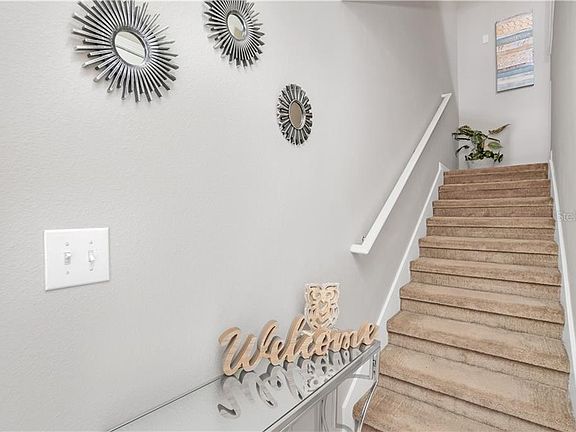 Resort Style Top floor Condominium unit with 3 bedrooms and 2 bathrooms, Open Plan, freshly painted and ready for move in! Live the vacation-type lifestyle year round right in the heart of Champions Gate. One car garage opens to 1st floor foyer which leads to staircase and upstairs living area. Beautiful kitchen, stainless steel appliances, modern ceramic tiles throughout common areas and carpet in the bedrooms. Ample sized Master bedroom with sliding glass door leading to Screened-in North facing balcony. This unit is a Split plan, with an indoor utility room with Washer & Dryer and a bonus area perfect for small home office. Champions Gate is located just minutes from Disney World, Universal Studios & International Drive. The residential community boasts golf courses designed by Greg Norman, plus 24-hour security guarded gate, community pool, lazy river, splash pad, fitness center, yoga room, movie theater, tennis courts and beautiful lush green walking trails and brick paved driveways all around and all with HOA fees that are lower than $330/month. Whether for your own enjoyment or for investment purposes, this move-in ready unit will not disappoint.