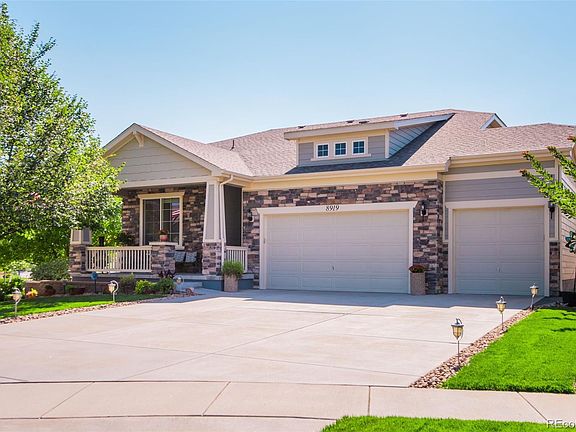 Welcome to this beautiful ranch-style home in the vibrant Whisper Creek community. Perfectly situated on a landscaped corner lot w/ no neighbors behind, this property offers a private yard. The outside space is your personal retreat, complete with a covered deck, patio, wood-burning fireplace, gas fire pit, water feature, and hot tub—creating the ultimate setting for relaxing or entertaining. Inside, the bright and open main floor is designed for effortless living. A private office with French doors provides a quiet and inspiring workspace, while the kitchen serves as the heart of the home with granite countertops, hickory cabinets, real hardwood flooring, a spacious island, a walk-in pantry, and an eat-in dining area. The dining space flows out to the back deck, making indoor-outdoor living seamless. The primary suite provides a serene escape with a luxurious 5-piece ensuite bath w/ LVP flooring that flows to the walk-in closet w/ lots of closet organizers and direct access to the laundry room for added convenience. A second bedroom and full bath complete the main level, offering flexibility. The finished basement enhances the home’s versatility, boasting quality LVP flooring throughout and features a wet bar, a theatre room w/ surround sound, and a private entrance for easy rental possibilities! A second primary suite in the basement includes an ensuite bath with a dual-head shower & jacuzzi tub, while a craft room could easily become a full kitchen with abundant storage. Additional highlights include a finished, heated three-car garage with Loft storage, a welcoming covered front porch, and owned solar panels for energy efficiency = monthly savings. Located near the scenic trails of Standley Lake and a short drive to shopping, dining, and entertainment, this home offers the best of nature and convenience. Whisper Creek’s amenities—pool, clubhouse, park and playground are a stone's throw away. Welcome HOME!!!