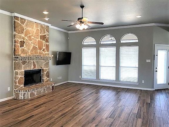 Gorgeous open concept living in this three bedroom, two bath home. Beautiful wood look ceramic tile throughout. Kitchen boast granite counter tops, stainless steel appliances including refrigerator. Natural stone wood burning fireplace. Freshly painted and move in ready. Great view from the front porch and a view of the orchard from the back patio. The spacious covered patio and back yard are great size for entertaining. Also, has a nice brick storage building. Washer and dryer included. Come take a look before it is gone!