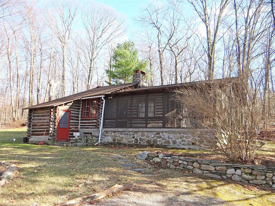 WONDERFUL LOG CABIN IN THE COUNTRY. THIS WELL MAINTAINED ONE BEDROOM DWELLING IS WELL SUITED FOR ITS FIVE ACRE WOODED LOT WITH WALKING TRAILS. EAT IN KITCHEN. COMFORTABLE AND COZY LIVING ROOM WITH SOARING CEILING AND BEAUTIFUL STONE FIREPLACE. FABULOUS SCREENED PORCH FOR SUMMER DINING. WONDERFUL LOCATION ON A SCENIC COUNTRY ROAD, SURROUNDED BY LARGE PARCELS. PRIVACY. A QUAINT CABIN, A PERFECT RETREAT FOR THOSE LOOKING FOR A VERY UNIQUE COUNTRY HOME.