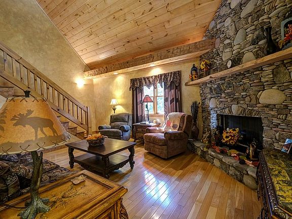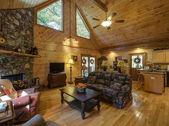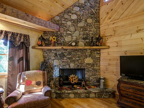 A Completely FURNISHED Custom Chalet in Brasstown less than 1 mile from the Folk School is waiting for you to make it YOUR OWN! This home sits on a 1 acre knoll with a grassy green lawn outlined with mature trees. Step on the wide porch with a swing to relax and enjoy the sights and sounds of nature. Inside is your Great Room with wood flooring, vaulted wood ceiling, hand hewn beams, and a stacked river rock corner fireplace to warm chilly mountain evenings. Spacious kitchen has a convenient pantry next to your dining area. Down the hall is your guest bed and combined guest bath/laundry area. Upstairs to your loft bonus area and private Master Ensuite. This will make you one HOME SWEET HOME!