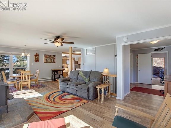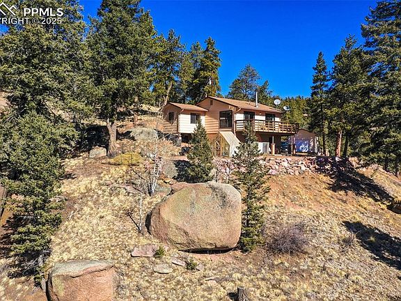 Nestled on 2 private acres, this charming 2-bedroom, 2-bath home offers breathtaking panoramic views of the Sangre de Cristo Mountain Range, Wrights Reservoir, and unique rock formations. Secluded yet accessible with county-maintained roads, this property provides the perfect escape for those seeking peace and tranquility. The recently remodeled kitchen features beautiful hickory cabinets and quartz countertops, complementing the hickory flooring throughout the home. An oversized one-car garage and a separate workshop—formerly used as a weaving studio—both have electricity, making them ideal for hobbies, storage, or additional workspace. Wildlife is abundant in the area, with frequent visits from deer, turkey, and fox, adding to the natural beauty of the surroundings. Despite the seclusion, you're only 30 minutes from Woodland Park or Cripple Creek, offering convenient access to shopping, dining, and entertainment. Whether you're looking for a full-time residence, a weekend getaway, or a vacation rental opportunity, this mountain retreat is a rare find. Minimal neighbors and a serene setting make it a true sanctuary in the heart of nature.