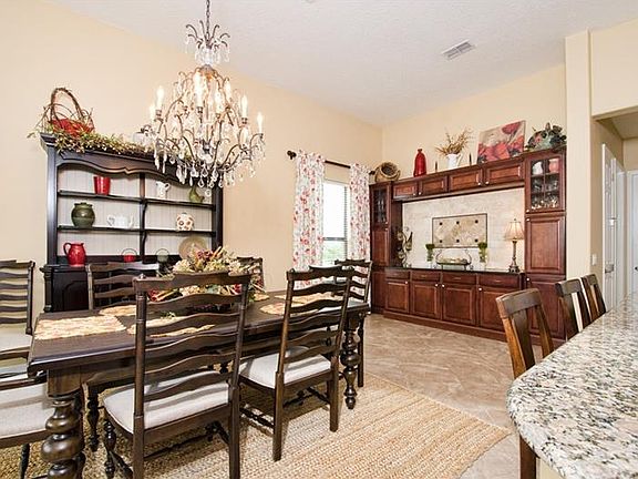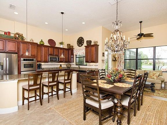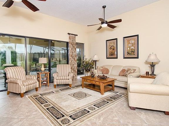 SOLIVITA-Impressive custom details can be seen throughout this elegant waterfront Biscayne model. This 3 bedroom, 3 full bath home has a year new easy care Pebbletek salt water pool with water features and extended lanai that overlooks a beautiful lake. Pass through the spacious courtyard and then enter this home and view the outside living area that includes an enclosed pool with additional sunning patio that overlooks the water. The Great room has a beautiful custom wall office as well as plenty of room to lounge and entertain. There is a bedroom/den off the great room that includes a full bath with access from the den/bedroom and kitchen area. The master bedroom is roomy and has plenty of vanity space as well as two sinks and walk-in closets and a tiled shower. There is another large bedroom suite that equals a second master. Enjoy a tranquil water view from this custom built kitchen which includes solid wood cabinets, double ovens, cook top, huge center island, closet pantry and tumbled marble backsplash. Then, off the kitchen there is a wall of patterned tumbled marble and a custom built in space that can be utilized as a butlers pantry or Entertainment center. There is also a nook that overlooks the water as well off the kitchen. The utility room includes a second full sized refrigerator as well as sink, custom cabinets and washer and dryer with room to spare. There is a full two car garage with golf cart garage. This home also has additional linen and storage closets. A "Must See!".