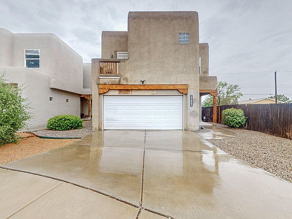 This charming southwest style patio home features a bright living area with cathedral ceilings and clerestory windows, creating a spacious and inviting atmosphere. The eat-in kitchen features an electric range, stainless appliances, updated granite countertops, a lovely dining area, and a walk-in pantry. The primary suite offers a separate corner bathtub, glass wall shower, large walk-in closet, and a balcony with stunning views of the Sandia Mountains, perfect for morning coffee or to relax and watch the sunset. Convenience is key with the upstairs laundry room, complete with storage. The home also includes refrigerated air and a large storage room in the garage.