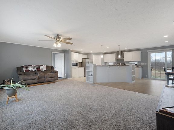 Located on just over 5 acres, this nearly new 2-bedroom (with potential for a 3rd), 2-bathroom home features 1,456 sq. ft. of thoughtfully designed living space. Inside the home, enjoy an open-concept layout with a spacious kitchen with a walk-in pantry, living room, and dining area. The primary suite boasts a large walk-in closet and a luxurious tile shower with a rainforest showerhead. An additional full bath, second bedroom, den/office complete the interior. Don't skip over the convenience of the large laundry/mud room just as you enter from the oversized 24x32 finished attached garage. This exceptional property offers the perfect blend of privacy, comfort, and functionality. A standout feature of this property is the 32x38 fully finished pole barn, built in 2021, complete with R-19 insulation, a furnace, a 5" concrete floor with drain, and ample room for projects or storage. The pole barn also houses a private "man cave"—a truly unique space completely finished with steel ceiling, new carpet, dimmable LED lighting & a ceiling fan. Perfect for entertaining or relaxing, this space offers comfort and versatility. The property is equipped with a generator hookup and multiple outdoor outlets. Surrounded by nature, this property offers a quiet, private setting with abundant wildlife, including deer and turkey. Whether you're looking to unwind, entertain, or pursue hobbies, this property is the ideal retreat.