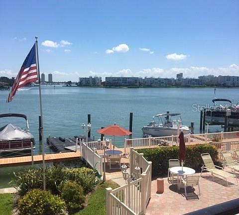 REDUCED!!!Water view of Intracoastal condo in beautiful and desirable Boca Shores Complex! These water facing units rarely come on the open market. Claim this fully furnished unit and spend your days and nights enjoying the beautiful sunrises and the lovely evening lights of the Intracoastal! This darling unit is bright and airy. Additional 80 feet is added to the square footage w/ the sun room making a total of 550 sq feet. A fabulous pool and sun deck sit on the bay. The complex has gorgeous, lush landscaping, and 5 day a week maintenance staff on site, who maintain the fabulous pool and property meticulously. A car wash with a vacuum is located on the property for the convenience of those occupying the property. The Condo Board has stable leadership. Included in the monthly condo fees are 2 cable boxes and wifi! This complex has very affordable boat slips for rent when available. Maximum boat length is 32 feet. A club house is available for your private parties! The complex is located 1/2 mile from the beaches at Treasure Island. The immediate area boasts a closely located dedicated dog park, playground, sits next public tennis courts, public boat launch, great restaurants, & public transportation is right outside complex. Winter rentals are in high demand at Boca Shores. This unit comes with a lease for January - March 2020 w/ a long time renter. No wait to rent! Come view view a fabulous opportunity to own a waterfront condo in a well-maintained and popular complex, for your own use or rental.