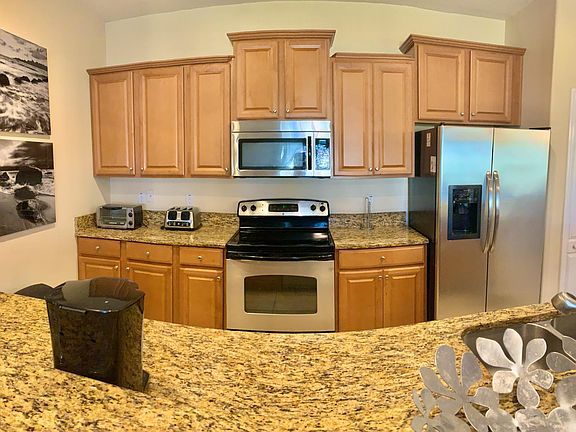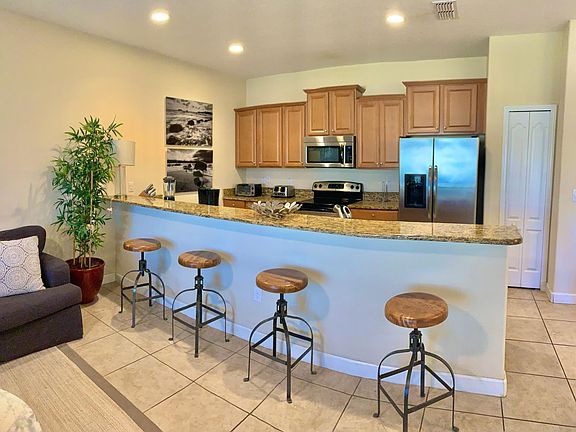 Breath-taking water view townhome with 4 bedrooms and 3 full bathrooms. Best of all, includes its own PRIVATE pool! This home is completely furnished with contemporary furniture, as well as a fully stocked kitchen. The kitchen has stylish granite countertops and stainless steel appliances. Lawn and pool care, valet trash, internet, and cable are all included. Conveniently contains one bedroom downstairs (with a queen bed), master bedroom upstairs (king bed), and 2 additional bedrooms upstairs (each with two single beds). All rooms contain TV's including the spacious family room. This unit is located in the gated community of Paradise Palms. It is just steps away from the resort-style clubhouse which contains a large family friendly community pool with cabanas, a fitness center, arcade, and a poolside bar that also serves snacks. Includes pool maintenance. Does not include water or electricity. $2,450 security deposit required if all qualifications are met. $75 application fee $150 Cleaning fee required before move-in. Renter's insurance required.