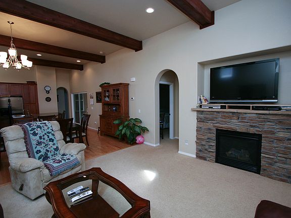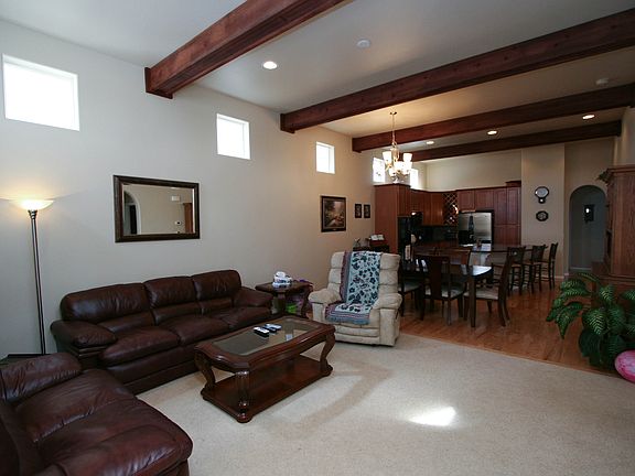 Beautiful 2-story home with main level master in a maintenance free community. This home has 10' beamed ceilings on the main level. It features a gourmet kitchen with corian counters, full tile backsplash, double ovens, huge island with bar top, gas cook top, and 42" cabinets. The finished basement has 9' ceilings, a huge rec room (44x14) and is pre-wired for surround sound. The upstairs is very private with two additional bedrooms, 15x13 loft and a covered patio. Newer roof. Incredible lot!!