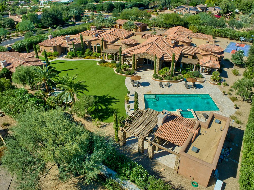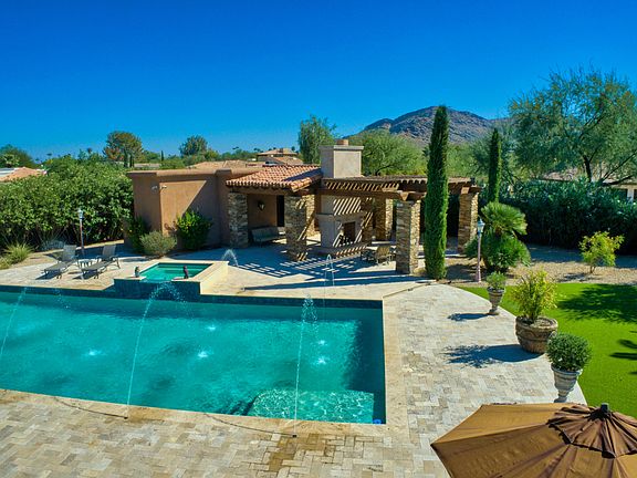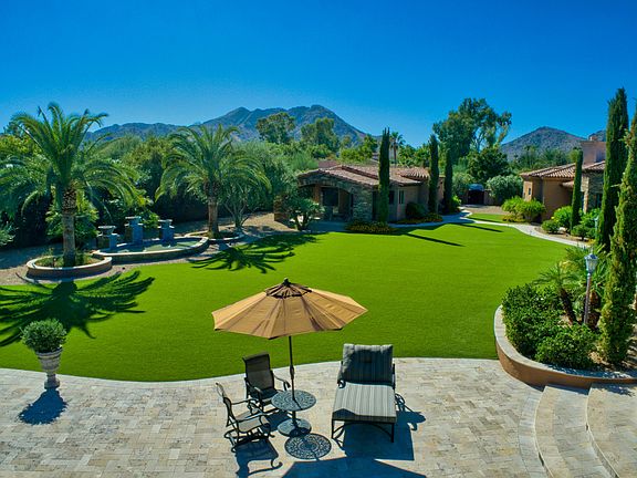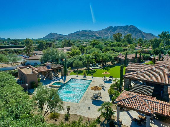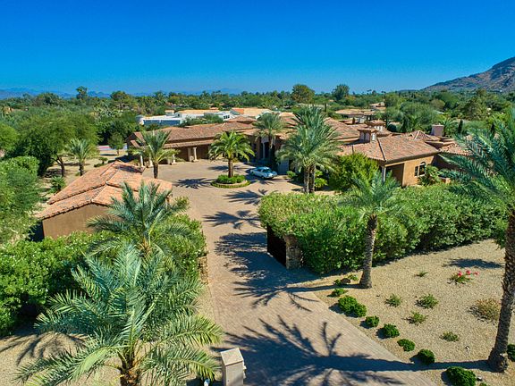 Gated exquisite Mediterranean Estate located in prime Paradise Valley! This luxurious custom home was built with the highest levels of craftsmanship and quality! As you pull through the majestic double gates you will enter a private auto court and sense what a rare special 2.3-acre estate this is. Home features hand-crafted cabinetry, stunning arched solid core doors, exquisite stonework and hand-carved fireplaces, countertops and kitchen sinks. The sumptuous master suite features groin vault ceiling above the sitting area with cozy fireplace, hardwood floors, and 10-foot windows looking to the backyard, dual custom walk-in closets with stackable washer/dryer and a luxurious bathroom suite to pamper every indulgence with stone counter tops, jacuzzi soaking tub, and steam shower. You don't have to walk too far to find a coffee bar with microwave, and dual sub-zero beverage drawers. Also, in the suite are his and hers water closet's for complete privacy. The generous sized library hosts a large walk-in closet, stone fireplace and wet-bar with beverage center, microwave and private courtyard entrance for your clients arrival. The large exercise room is expertly appointed with mirrored wall and rubberized flooring. Three additional spacious en-suite bedrooms (one that could be a secondary master with private entrance) and playroom or music room are located at the opposite end of the home for ultimate privacy. The movie theatre seats 12 with tiered seating and boasts a wet bar, microwave and beverage center. Don't miss the venetian plastered billiards/game room with bar and private entrance. The expansive family room offers an elaborate 500+ bottle wine cellar, wet bar and motorized telescoping doors that capture the surrounding mountain views. Step outside and enter a private world of your own! Expansive turf lawns for entertaining, plenty of covered patio and gazebo areas for alfresco dining and viewing dramatic sunsets, a tranquil fountain, and a lighted full N/S facing sport court. Soak in the sun at the swimming pool and spa flanked by the pool house and pool pavilion featuring graceful columns and grand outdoor Cantera stone fireplace. A 2-bedroom/2 bath guest house with full kitchen and family room grace the West side of the back yard. The motor court features an attached 3-6 car spacious garage, and an additional 3 car carriage house. Full house water filtration system, central vacuum, security camaras, & Crestron smart home to control it all from one device. The surrounding views of Mummy Mountain and the Phoenix Mountain Preserve completes this private estate.