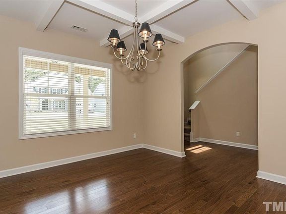 OXFORD AMERICANA completed on wooded homesite! 2-story foyer opens to Great Room w/fireplace.Main floor guest bdrm/study-full bath.Hdwd floors in foyer & dining w/coffered ceiling. Arched doorways and vaulted ceilings throughout. Kitchen-36" cabinets w/crown, SS appliances, granite counters & large island. Master suite incl dome ceiling, sitting room, walk-in closet. Bath features linen closet, double vanity. Huge bonus room/closet;Covered porch. deep wooded wow lot-Wake Co Schools BACK UP OFFERS accepted