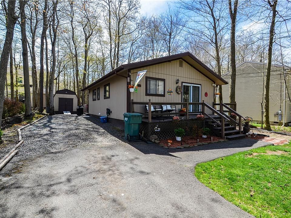 Welcome to your serene retreat in the short term rental friendly, Pocono Country Place! This adorable 3-bedroom, 1.5-bath ranch home offers cozy living with updated features. Relax and unwind on the front and back decks, perfect for enjoying your morning coffee. Plus, there's ample storage space in the convenient storage shed and a paved driveway for hassle-free parking. Step inside to discover a tastefully updated living room, exuding warmth and welcome. Cozy up by the wood-burning fireplace on chilly evenings. The light and bright kitchen is seamlessly connected to the living room. Prepare delicious meals with ease while staying connected to the heart of the home. The master bedroom boasts a convenient half bath and access to the tranquil rear deck. Enjoy peaceful moments of relaxation in your own private sanctuary. Nestled within a community that boasts exceptional amenities, including beaches, a clubhouse, outdoor pool, and 24/7 gated security, you'll experience peace of mind and endless recreation possibilities. Located just minutes away from Route 80, shopping centers, Mount Airy Casino, Kalahari Resort, Aquatopia, Camelback Resort, state parks, water sports, hiking, fishing, and more, this location provides convenient access to a plethora of entertainment and outdoor activities!