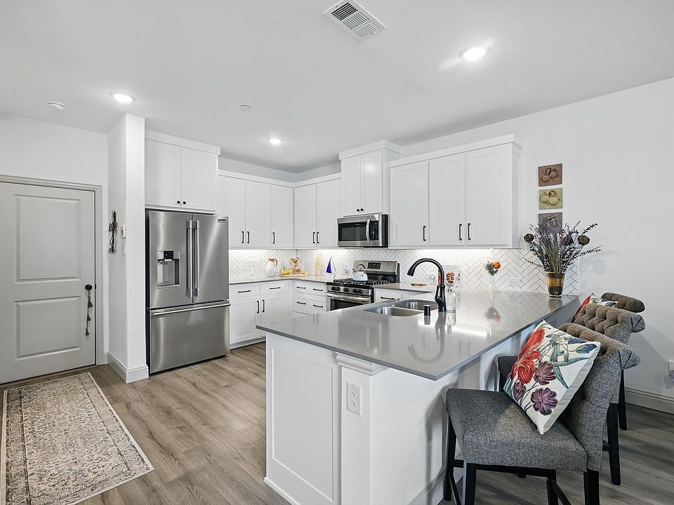 Most Affordable Townhome in the neighborhood!!! One owner, no pets and meticulously maintained. Perfectly situated in one of Frisco’s most sought-after master-planned communities, The Grove! This stunning townhome features the designer's timeless interior finishes, creating a warm and upscale ambiance throughout. The heart of the home is the chef-style kitchen, complete with a spacious pantry, gas cooktop, stainless steel appliances, stunning herringbone backsplash and thoughtful upgrades like pot and pan drawers and under cabinet lighting ideal for everyday cooking or weekend entertaining. Soaring 20-foot ceilings and expansive windows in the living room flood the space with natural light, making the home feel open, bright, and inviting. Upstairs, a spacious loft provides the perfect flex space ideal for a second living area, home office, exercise room or extra sleeping space. Retreat to the owner's suite, where you'll find an oversized shower, a linen closet, custom cabinetry and a generous walk-in closet with a custom closet system. Every detail has been considered, from comfort to convenience. This home also features smart home automation, including a video doorbell, HDMI bundle in the family room, and enhanced Wi-Fi for seamless connectivity throughout. Unrivaled community features include a fitness center, hiking trails, multiple parks including a dog park, two pools & a splash pad, and more to come! HOA takes care of all exterior landscape needs including ALL watering, mowing & edging, manicured flower beds & mulch, replacement of struggling or dead plants including trees. HUGE savings on money, time and effort! Don’t miss the opportunity to own a low-maintenance, high-style home in an unbeatable Frisco location.
