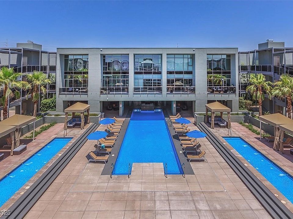 Modern open floor plan w resort style, pool view 3rd floor unit, 2 large bedrooms w 2 baths, stainless KitchenAid appliances, granite counters. The Modern's amenities include a concierge, guard security, 3 swimming pools, spa, heated outdoor Jacuzzi, BBQ's, 2 story fitness center, yoga, massage room, sauna, steam room, 3 firepits, various outdoor seating area, 4 Elevators, game room, pool table, underground Parking with gated. Easy parking... Just minutes from the Strip, Convenient location closes to shopping, restaurant... must see