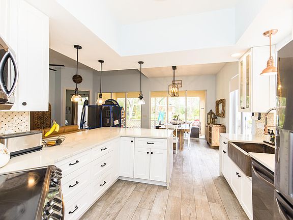 Beautifully remodeled with newer kitchen featuring white shaker cabinets, glimmering white quartz counters, farm sink and stainless steel appliances. in sought after Divosta community of Carleton Oaks. Volumn ceilings in the living areas with newer Porcelain tile wood look floors! Master bathroom features His/Hers bathrooms and master bedroom has 3 closets. 4th room could be an office, 4th bedroom or ..... Private backyard overlooks 1000's of acres of Preserve. Watch the deer, turkeys, rabbits & wildlife from your spacious covered & screened back porch. Gated community features heated pool, tennis, pickle ball & Basketball. HOA fee includes all lawn care, sprinklers, pressure cleaning, house painting and community amenities. Other features include central vac, laundry room sink.