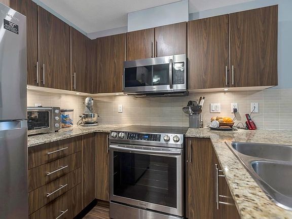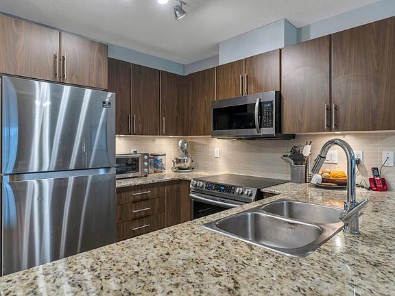 Welcome to the popular Grove complex! This top floor two bedroom plus den is the perfect starter home. It features a generous kitchen with brand new appliances, quartz counter-tops and breakfast bar. Great open dining and living room that leads to a large covered deck, perfect for those who like to entertain. Large master with walk-in closet and ensuite. Centrally located; you are just a short walk to everything from theatres, shopping, restaurants, and pubs, and a short drive to rec-centre, and easy access highway 1. Comes with 2 parking spots and a storage locker. Showings by appointment Saturday and Sunday 2-4. Call your agent to book today!
