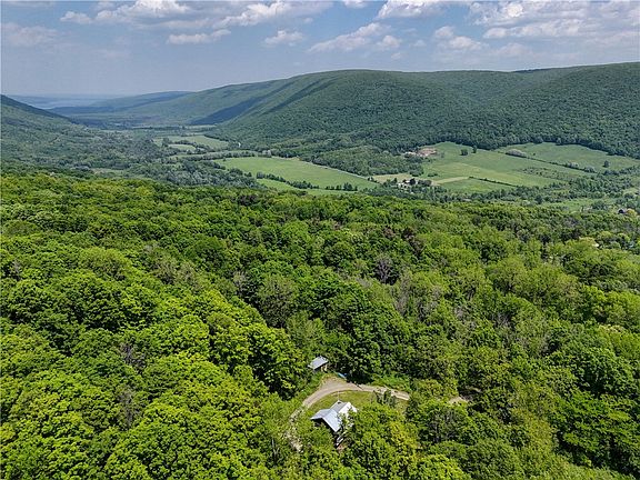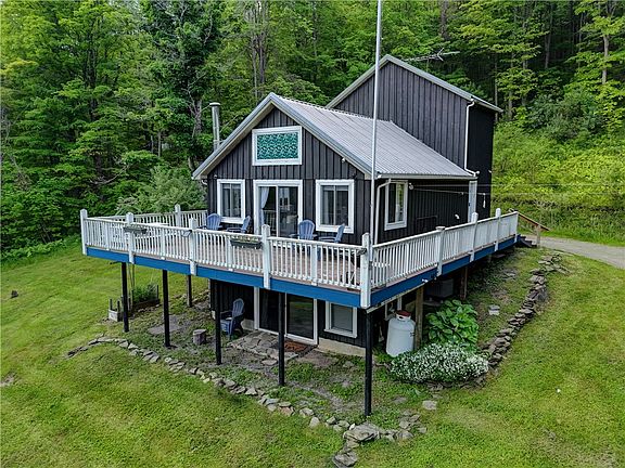 Escape to this beautifully updated incredible hillside retreat on 3.9 acres! Take in all the tranquil calm or share it with others for a five-star vacation retreat! Just a short drive away from the Finger Lakes, walking trails, numerous wineries & breweries, Bristol Mountain skiing and all the outdoor adventures you can imagine. Gorgeous eat-in kitchen with white cabinets, granite countertops, stainless steel appliances (new sleek compact microwave and new stove-2023) and island. Adjoining living room with cathedral ceilings and sliding glass door leading to amazing two-story wrap-around deck with breathtaking views. Updated full bath with walk-in shower on the first floor along with one bedroom and convenient foyer area. Upstairs features an additional spacious primary bedroom with adjoining bonus loft space. The lower level features a cozy family room with woodstove and second sliding glass door to the outside. Two sheds (one with electric) and a fire pit on the property. Heat pump (2023), Metal roof (2010), Tankless hot water tank (2004). All kitchen appliances and washer & dryer included. Potential vacation rental business opportunity and consideration to sell furnished with acceptable offer. Don't miss the aerial video tour! Delayed Negotiations begin on Monday, June 16th at 3:00 PM. Reckhow is a shared single lane private drive with two other houses. House is located at the end off a long single lane private driveway. There is no ability to "drive by". No Open house. By appointment only.