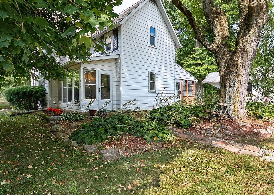 Vintage farmhouse on park like setting with pond, apple trees, on 2.2 acres backing to trees. Very peaceful and quiet! HUGE 3 car detached barn/garage (new garage doors) with ample storage for boat, cars, truck, etc plus a loft. Private patio and summer kitchen with electric for your outdoor entertainment or simply for more storage. Ideal property for large gatherings, bon fires, entertaining. The interior features a large country kitchen, main floor laundry, a screened in front porch, additional 4 season room. Upstairs are 3 nicely sized bedrooms with closets. Newer items include: roofs on patio and garden sheds, propane and central A/C, tankless water heater, septic, HE furnace, gutters/downspouts. Great mechanicals! Home is over 100 years old and a true classic.