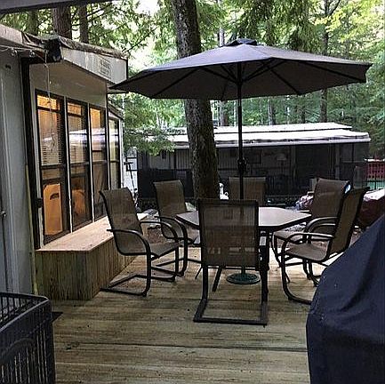 1988 Breckenridge Lodge Home with 25 X 8 Sunroom, has front porch and rear patio/deck. New windows, flooring, refrigerator, microwave, kitchen island. Has propane heat and stove comes with most furnishings right down to silverware. Has storage shed, patio furniture, kayaks, golf cart and assorted tools. Unit is located at Point Sebago Resort which features all sorts of activities and entertainment May thru October.